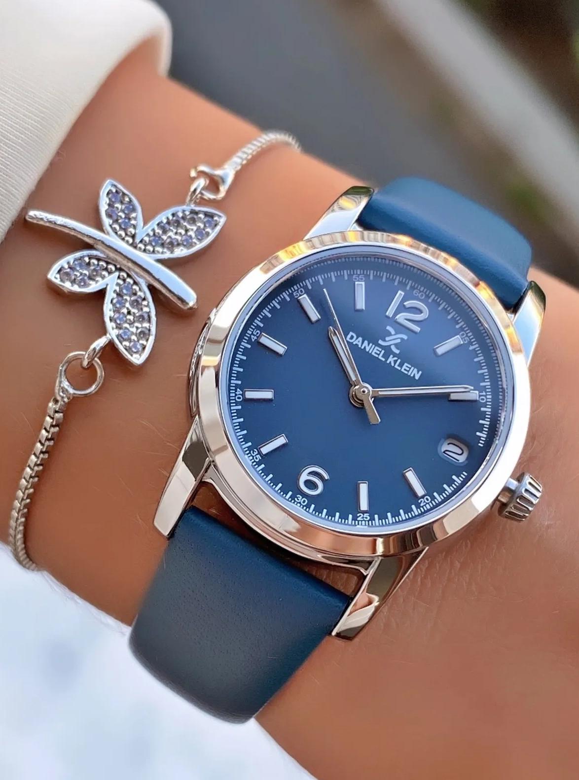 Женские наручные часы Daniel Klein Premium 13822-3. Точный кварцевый механизм с аналоговой индикацией. Ремешок изготовлен из кожи. После настройки автоматический календарь всегда отображает точную дату. Латунный браслет. Прочное, устойчивое к царапинам минеральное стекло защищает часы от повреждений. На циферблате отображается текущее число месяца. Часы являются водонепроницаемыми до 3 Бар. Цвет циферблата: Серебристый. Цвет корпуса: Синий. На стрелки и отметки нанесен светонакопительный состав, благодаря этому считывать информацию с циферблата возможно и в темноте. Толщина: 8 мм. Гарантия: 1 год.