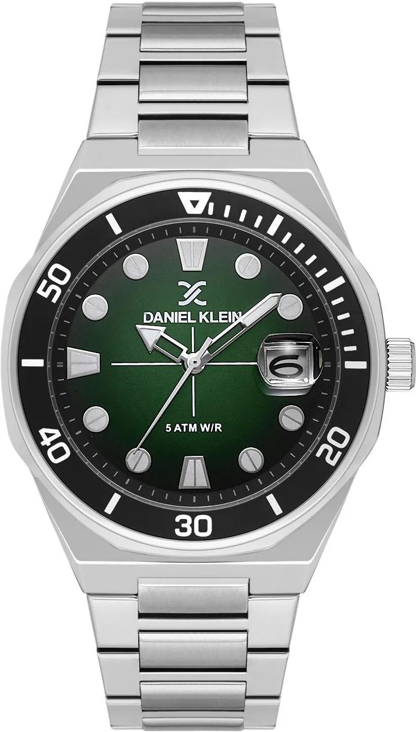 Мужские наручные часы Daniel Klein Premium 13989-4. Точный кварцевый механизм с аналоговой индикацией. В отличие от механических часов, не требуют завода и работают от батареи, показывая отклонение всего несколько секунд в месяц. На стрелки и отметки нанесен светонакопительный состав, благодаря этому считывать информацию с циферблата возможно и в темноте. Браслет из нержавеющей стали обладает высокой прочностью и износостойкостью, обеспечивая долговечность даже при активной эксплуатации. Материал устойчив к коррозии и сохраняет свой внешний вид надолго. Корпус изготовлен из высококачественной часовой латуни с высокими антикоррозийными свойствами. Прочное, устойчивое к царапинам минеральное стекло защищает часы от повреждений. Часы являются водонепроницаемыми до 5 Бар. Цвет корпуса: Серебристый. Цвет циферблата: Зеленый. Высота (с ушками): 50 мм. Толщина: 12 мм. Гарантия: 1 год.