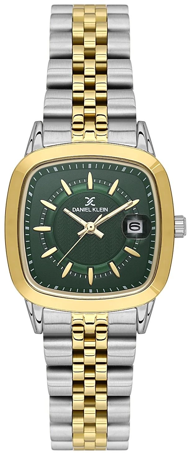 Женские наручные часы Daniel Klein Premium 14129-5. Точный кварцевый механизм с аналоговой индикацией. В отличие от механических часов, не требуют завода и работают от батареи, показывая отклонение всего несколько секунд в месяц. Браслет из нержавеющей стали обладает высокой прочностью и износостойкостью, обеспечивая долговечность даже при активной эксплуатации. Материал устойчив к коррозии и сохраняет свой внешний вид надолго. Корпус изготовлен из высококачественной часовой латуни с высокими антикоррозийными свойствами. Прочное, устойчивое к царапинам минеральное стекло защищает часы от повреждений. Часы являются водонепроницаемыми до 3 Бар. Цвет корпуса: Серебристый. Цвет корпуса: Желтое золото. Цвет циферблата: Зеленый. Высота (с ушками): 32 мм. Гарантия: 1 год.