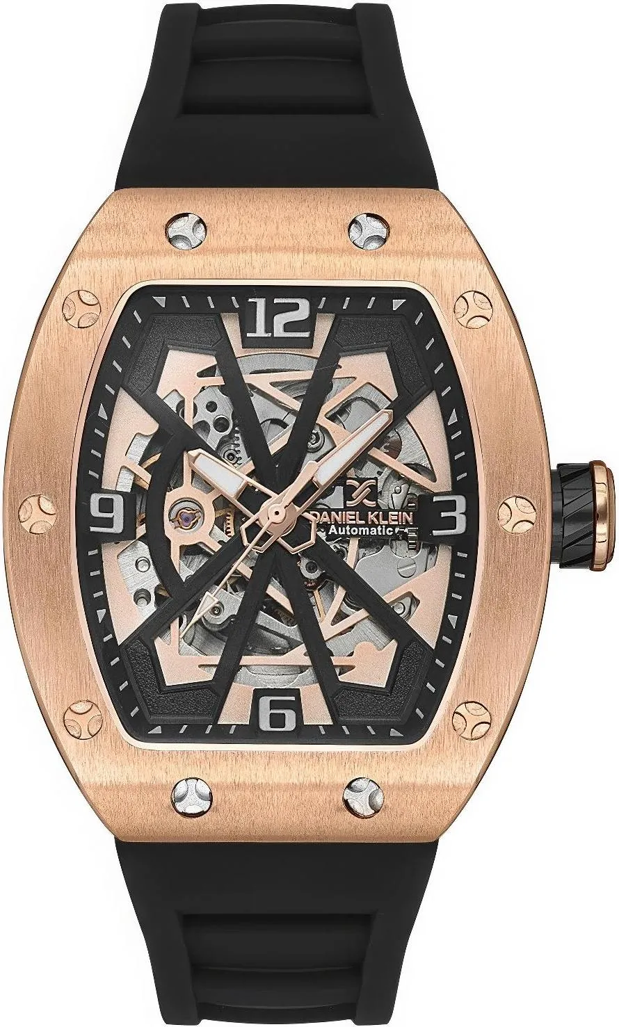 Мужские наручные часы Daniel Klein Skeleton 13634-3. Механические с автоподзаводом. Пружина механизма заводится автоматически благодаря естественным движениям владельца в процессе ежедневной носки часов. Силиконовый ремешок. Латунный браслет. Прочное, устойчивое к царапинам минеральное стекло защищает часы от повреждений. Часы являются водонепроницаемыми до 5 Бар. Цвет циферблата: Розовое золото. Цвет корпуса: Черный. На стрелки и отметки нанесен светонакопительный состав, благодаря этому считывать информацию с циферблата возможно и в темноте. Толщина: 15 мм. Гарантия: 2 года.