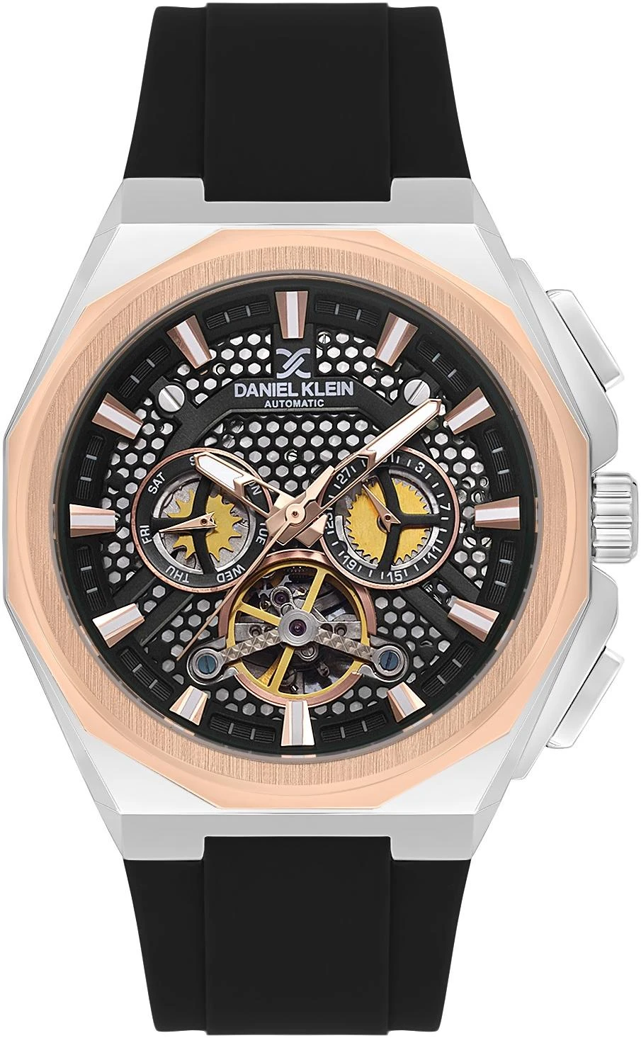 Мужские наручные часы Daniel Klein Skeleton 13858-3. Механические с автоподзаводом. Пружина механизма заводится автоматически благодаря естественным движениям владельца в процессе ежедневной носки часов. На стрелки и отметки нанесен светонакопительный состав, благодаря этому считывать информацию с циферблата возможно и в темноте. Силиконовый ремешок. Корпус изготовлен из высококачественной часовой латуни с высокими антикоррозийными свойствами. Прочное, устойчивое к царапинам минеральное стекло защищает часы от повреждений. Часы являются водонепроницаемыми до 5 Бар. Цвет корпуса: Серебристый. Цвет циферблата: Черный. Высота (с ушками): 44 мм. Толщина: 15 мм. Гарантия: 1 год.