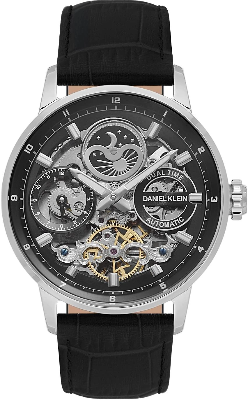 Мужские наручные часы Daniel Klein Skeleton 14013-1. Механические с автоподзаводом. Пружина механизма заводится автоматически благодаря естественным движениям владельца в процессе ежедневной носки часов. На стрелки и отметки нанесен светонакопительный состав, благодаря этому считывать информацию с циферблата возможно и в темноте. Ремешок изготовлен из кожи. Гибкость такого ремешка позволяет точно регулировать посадку часов на руке. Корпус изготовлен из высококачественной часовой латуни с высокими антикоррозийными свойствами. Прочное, устойчивое к царапинам минеральное стекло защищает часы от повреждений. Часы являются водонепроницаемыми до 5 Бар. Цвет корпуса: Серебристый. Цвет циферблата: Черный. Высота (с ушками): 43.5 мм. Толщина: 14 мм. Гарантия: 1 год.