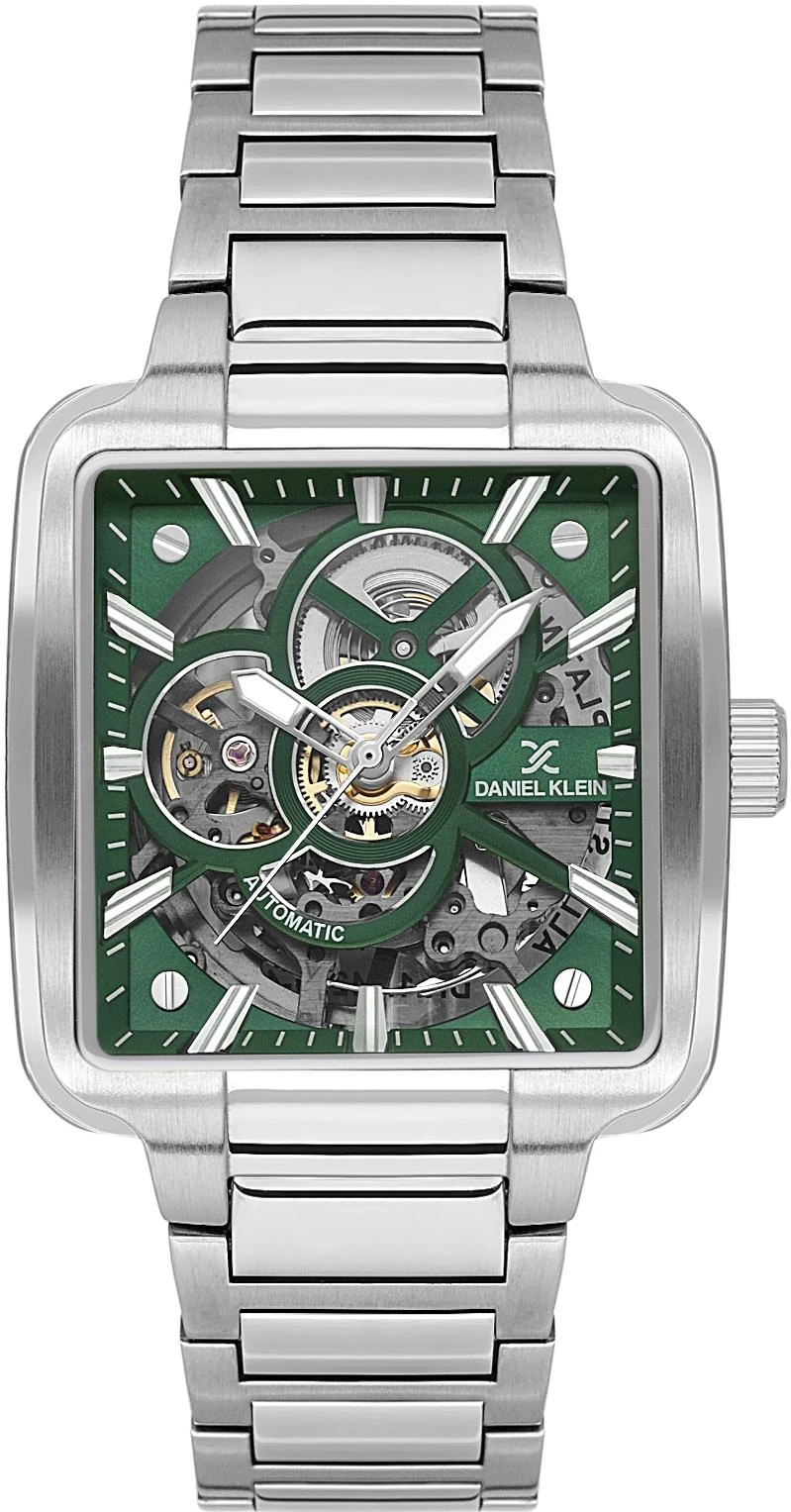 Мужские наручные часы Daniel Klein Skeleton 14279-4. Механические с автоподзаводом. Пружина механизма заводится автоматически благодаря естественным движениям владельца в процессе ежедневной носки часов. Браслет из нержавеющей стали обладает высокой прочностью и износостойкостью, обеспечивая долговечность даже при активной эксплуатации. Материал устойчив к коррозии и сохраняет свой внешний вид надолго. Корпус изготовлен из высококачественной часовой латуни с высокими антикоррозийными свойствами. Прочное, устойчивое к царапинам минеральное стекло защищает часы от повреждений. Часы являются водонепроницаемыми до 3 Бар. Цвет корпуса: Серебристый. Цвет циферблата: Зеленый. Высота (с ушками): 39 мм. Гарантия: 1 год.