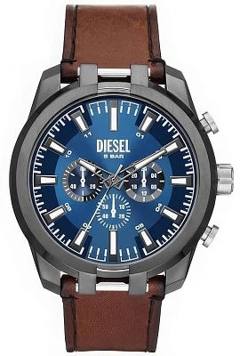 Мужские наручные часы Diesel Split DZ4643. Точный кварцевый механизм с аналоговой индикацией. Корпус изготовлен из высококачественной нержавеющей стали 316L с высокими антикоррозийными свойствами. На стрелки и отметки нанесен светонакопительный состав, благодаря этому считывать информацию с циферблата возможно и в темноте. Хронограф. Ремешок изготовлен из кожи. Прочное, устойчивое к царапинам минеральное стекло защищает часы от повреждений. Часы являются водонепроницаемыми до 5 Бар. Цвет корпуса: Серебристый. Цвет циферблата: Синий. Ширина (с заводной головкой): 51мм. Толщина: 13мм. Гарантия: 2 года.