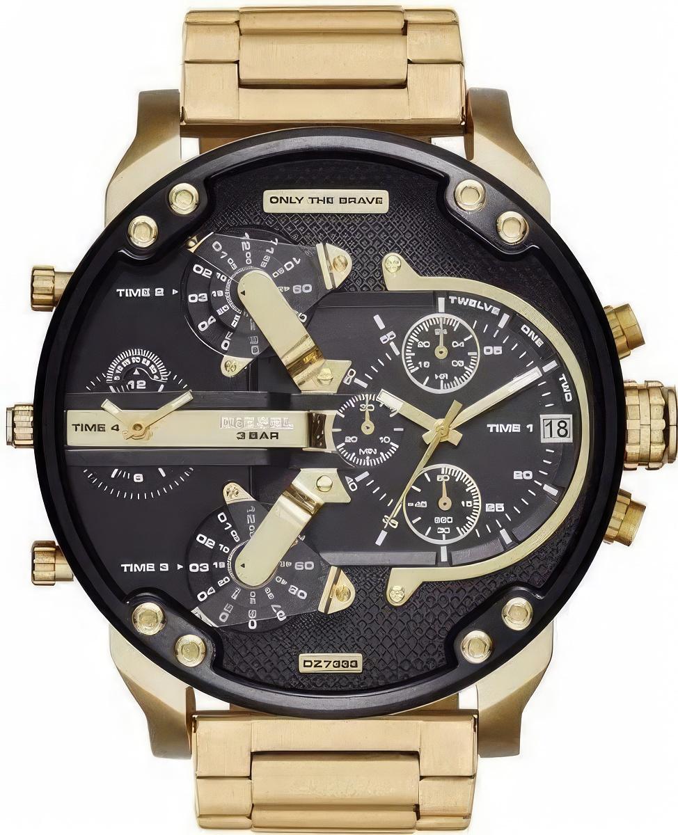 Четыре независимых механизма в одних часах, функция хронографа и дисковые индикаторы времени во втором часовом поясе. Массивные, внушительные мужские часы на браслете цвета золота. Черный циферблат с блестящими акцентами.