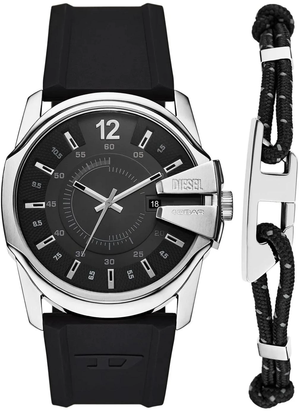 Мужские наручные часы Diesel Master Chief DZ4700SET. Точный кварцевый механизм с аналоговой индикацией. В отличие от механических часов, не требуют завода и работают от батареи, показывая отклонение всего несколько секунд в месяц. Силиконовый ремешок. Корпус изготовлен из высококачественной нержавеющей стали 316L с высокими антикоррозийными свойствами. Прочное, устойчивое к царапинам минеральное стекло защищает часы от повреждений. Часы являются водонепроницаемыми до 10 Бар. Цвет корпуса: Серебристый. Цвет циферблата: Черный. Гарантия: 2 года.