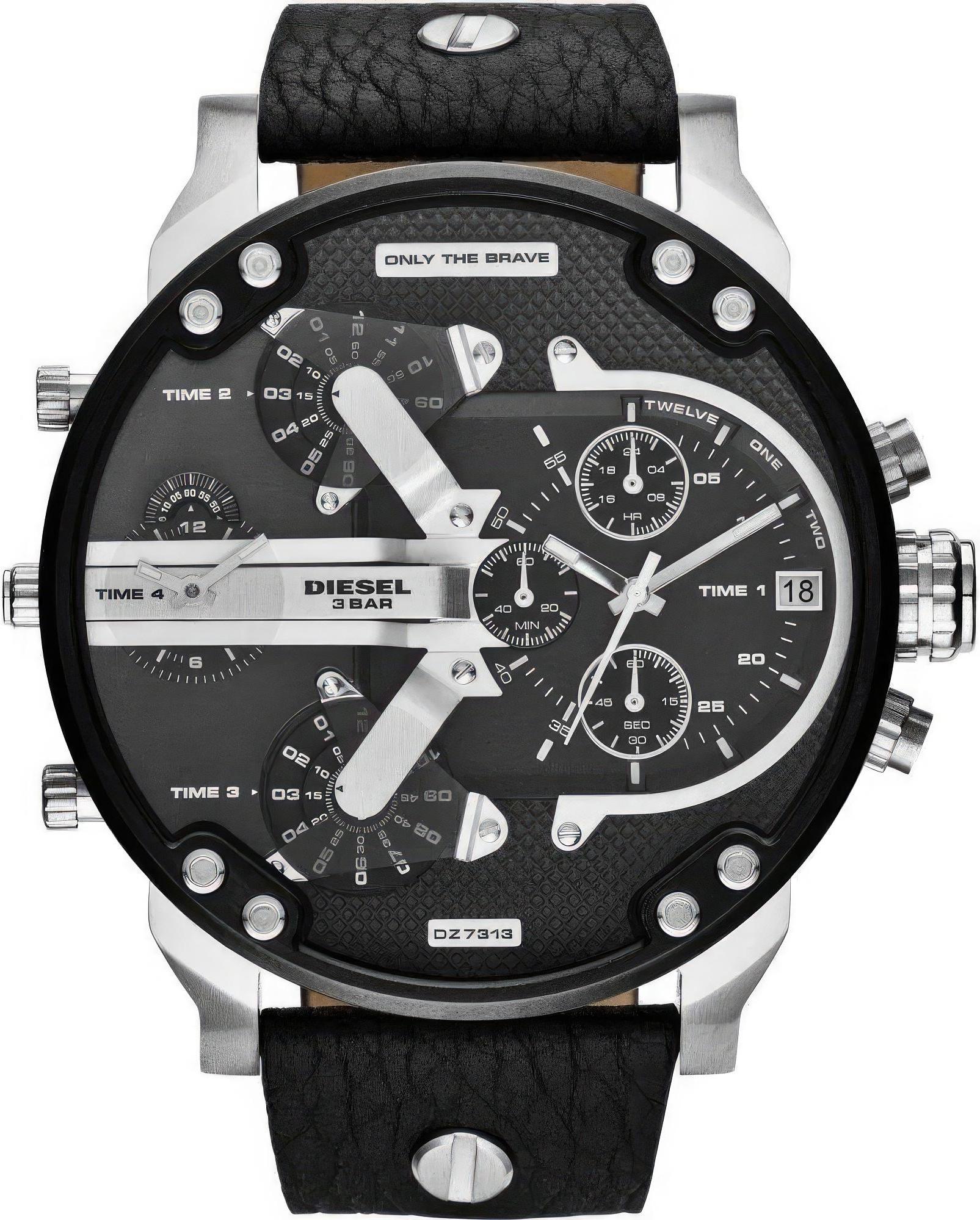 Мужские наручные часы Diesel Six DZ7313. Точный кварцевый механизм с аналоговой индикацией. Корпус изготовлен из высококачественной нержавеющей стали 316L с высокими антикоррозийными свойствами. На стрелки и отметки нанесен светонакопительный состав, благодаря этому считывать информацию с циферблата возможно и в темноте. На циферблате отображается текущее число месяца. Функция хронографа. Ремешок изготовлен из кожи. Прочное, устойчивое к царапинам минеральное стекло защищает часы от повреждений. Часы являются водонепроницаемыми до 3 Бар. Цвет корпуса: Серебристый. Цвет циферблата: Черный. Ширина (с заводной головкой): 57мм. Толщина: 14мм. Гарантия: 2 года.