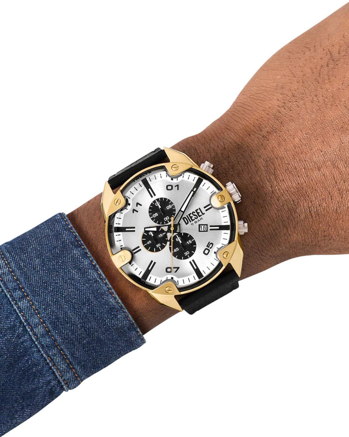 Эти мужские часы-хронограф сочетают в себе индустриальную эстетику и изысканность. Круглый стальной корпус с декоративными винтами придает модели брутальный шарм, а циферблат с эффектом «солнечных лучей» (Sunray) и комбинацией штрихов с арабскими цифрами обеспечивает великолепную читаемость. Функциональность подчеркнута окошком даты на 4 часа и надежной рифленой заводной головкой. Модель оснащена завинчивающейся задней крышкой для повышенной защиты и комфортным кожаным ремешком, который завершает образ в стиле модерн-классики.