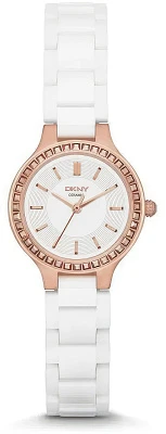 Женские наручные часы в стальном круглом корпусе с позолотой, секундная стрелка центральная, вместо цифр риски, на белом керамическом браслете.