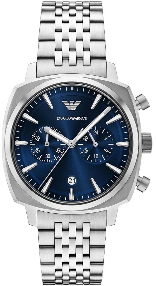Мужские наручные часы Emporio Armani Carlo AR11688. Точный кварцевый механизм с аналоговой индикацией. В отличие от механических часов, не требуют завода и работают от батареи, показывая отклонение всего несколько секунд в месяц. Браслет из нержавеющей стали обладает высокой прочностью и износостойкостью, обеспечивая долговечность даже при активной эксплуатации. Материал устойчив к коррозии и сохраняет свой внешний вид надолго. Функция хронографа. Отображение времени возможно в 12-часовом или 24-часовом формате. Корпус изготовлен из высококачественной нержавеющей стали 316L с высокими антикоррозийными свойствами. Прочное, устойчивое к царапинам минеральное стекло защищает часы от повреждений. Часы являются водонепроницаемыми до 5 Бар. Цвет корпуса: Серебристый. Цвет циферблата: Синий. Толщина: 13 мм. Гарантия: 2 года.