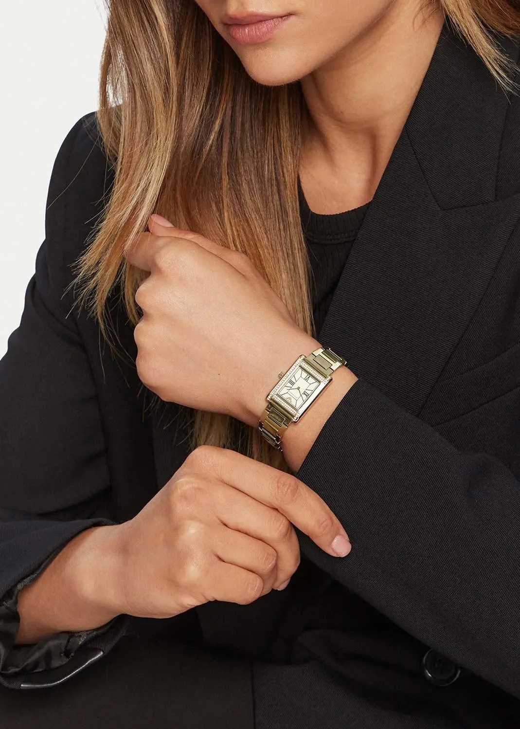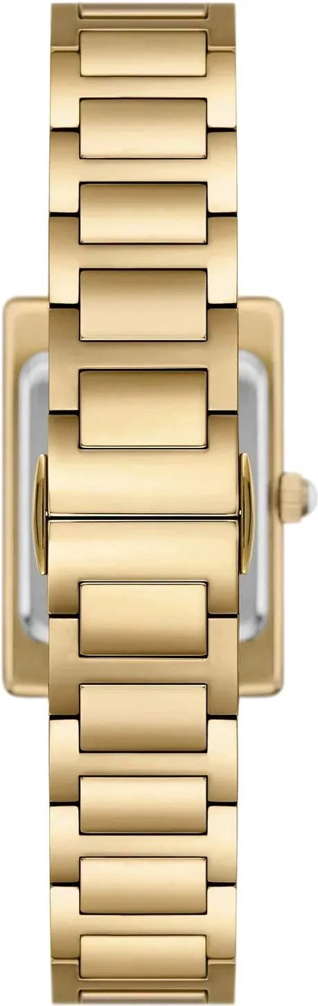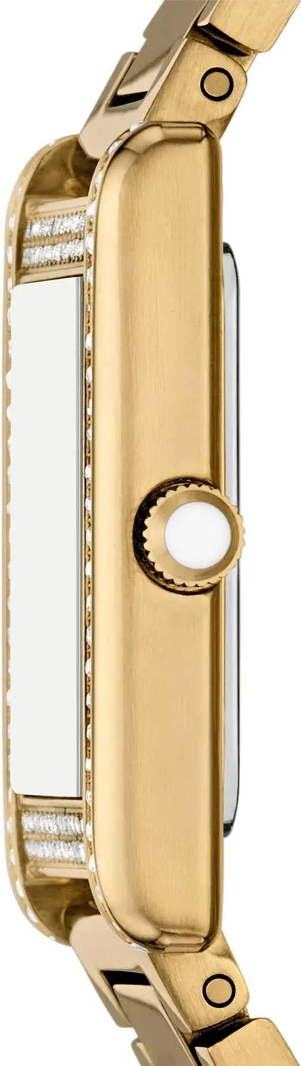 Эти женские наручные часы сочетают в себе геометричную строгость и изысканную роскошь. Прямоугольный стальной корпус обрамлен безелем, сверкающим кристальным паве. Лаконичный матовый циферблат с метками в виде римских цифр придает модели классическое звучание, а отсутствие секундной стрелки подчеркивает ее утонченную сдержанность. Особый шарм часам придает рифленая заводная головка, увенчанная изящным кабошоном. Модель завершается стальным браслетом с удобной раскладывающейся застежкой.
