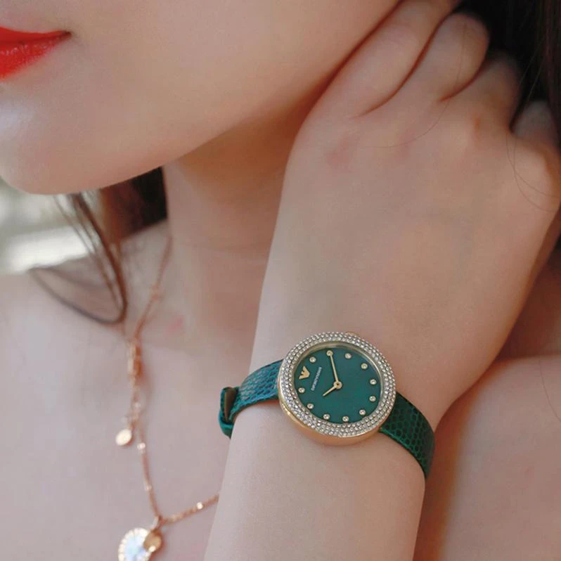 <b>Женские кварцевые часы из серии Rosa. Круглый стальной корпус с PVD покрытием цвета желтого золота и перламутровый зеленый циферблат украшены кристаллами. Минеральное стекло. Водозащита 30 м. Зеленый кожаный ремешок. Классическая пряжка.</b><br><br>• Точный кварцевый механизм.<br>• Центральные часовая и минутная стрелки.<br>• Точность хода не хуже от -10 до +20 сек. в месяц.<br>• Минеральное стекло устойчивое к возникновению царапин.<br>• Перламутровый зеленый циферблат с метками в виде точек украшенных кристаллами.<br>• Корпус из нержавеющей стали со стойким PVD покрытием цвета желтого золота декорирован кристаллами по безелю.<br>• Рифленая заводная головка.<br>• Водозащита до 3 АТМ.<br>• Зеленый кожаный ремешок текстурирован под кожу ящерицы.<br>• Ширина ремешка 12 мм.<br>• Классическая ремешковая застежка.
