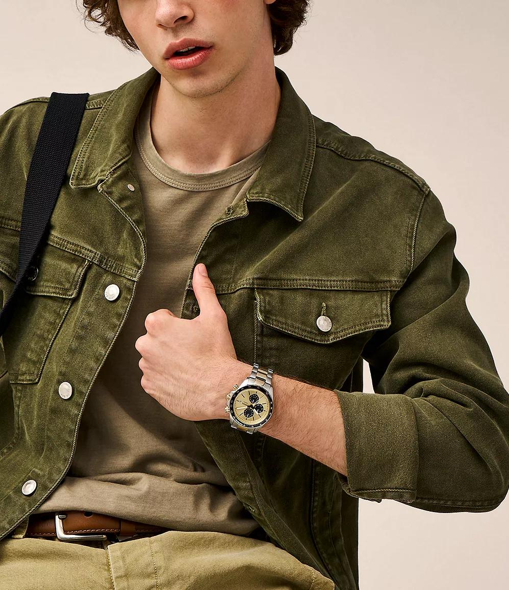 Современная интерпретация классических гоночных часов. Autocross переосмысливает спортивный стиль. Классический золотистый циферблат с эффектом солнечных лучей и черными дополнительными циферблатами контрастирует с корпусом и двухцветным браслетом из нержавеющей стали. Благодаря кварцевому механизму с несколькими субциферблатами, отображающими двойное время и день недели, эти 42-миллиметровые часы обеспечивают дополнительную функциональность для ваших повседневных приключений. Модель выполнена в динамичном гоночном стиле: безель дополнен классической тахиметрической шкалой. Водозащита 50 метров (5 АТМ/bar): выдерживают мытье рук, попадание крупных капель.
