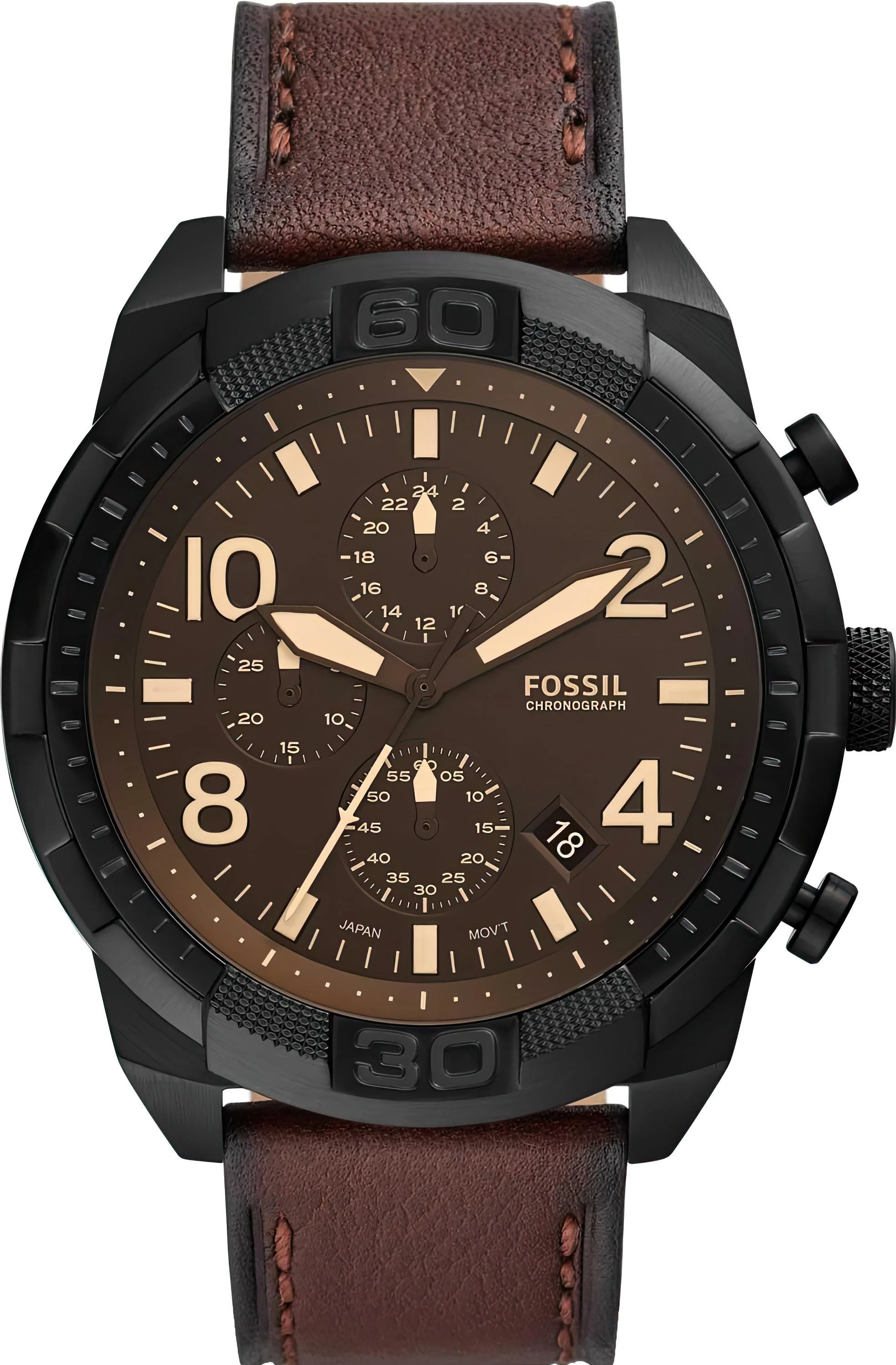Мужские кварцевые часы с хронографом из серии Bronson Chronograph. Круглый стальной корпус с покрытием черного цвета. Коричневый циферблат. Минеральное стекло. Водозащита 50 м. Коричневый ремешок из эко-кожи с системой быстрой замены. Простая пряжка.