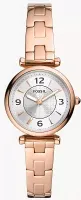 Женские наручные часы Fossil Carlie ES5202. Точный кварцевый механизм с аналоговой индикацией. Корпус изготовлен из высококачественной нержавеющей стали 316L с высокими антикоррозийными свойствами. На стрелки и отметки нанесен светонакопительный состав, благодаря этому считывать информацию с циферблата возможно и в темноте. Браслет из нержавеющей стали. Прочное, устойчивое к царапинам минеральное стекло защищает часы от повреждений. Часы являются водонепроницаемыми до 5 Бар. Цвет корпуса: Розовое золото. Цвет циферблата: Серебристый. Ширина (с заводной головкой): 28мм. Толщина: 12мм. Гарантия: 2 года.