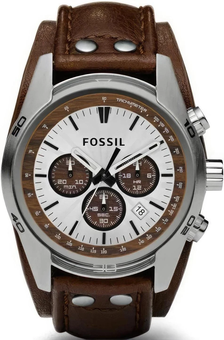 Мужские наручные часы, оснащённые хронографом с тахометрической шкалой, выполненные в спортивном стиле на широком кожаном ремешке коричневого цвета.