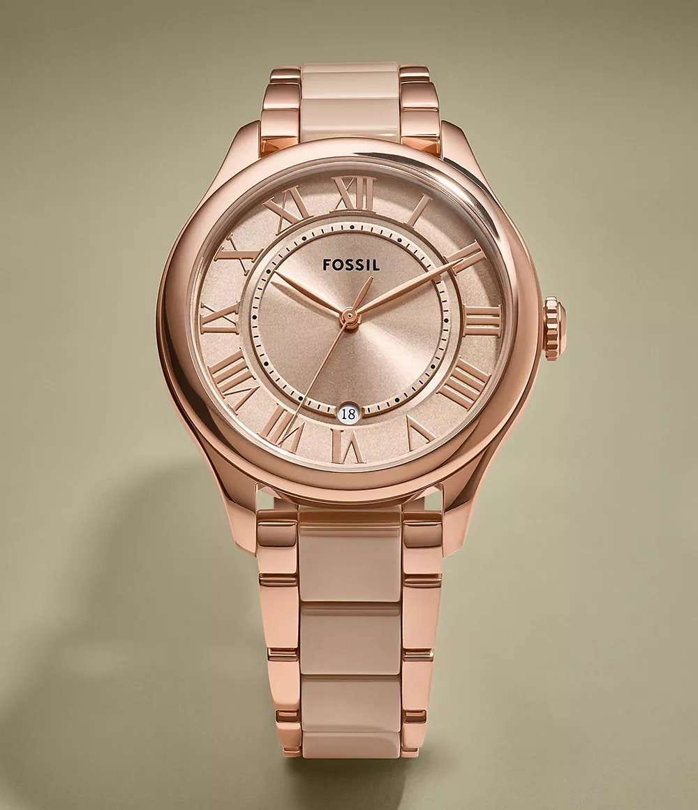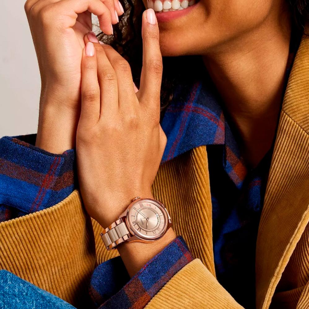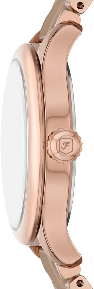 Женские кварцевые часы Fossil — это элегантный аксессуар, сочетающий стиль и надежность. Модель CE1133 выполнена в круглом корпусе диаметром 38 мм из нержавеющей стали с покрытием цвета розового золота. Циферблат бежевого цвета оформлен индексами и стрелками. Окошко даты расположено в положении 6 часов. Циферблат защищен минеральным стеклом. Часы оснащены браслетом из керамики и стали с покрытием. Водонепроницаемость 50 метров (5 АТМ/bar): выдерживают мытье рук, попадание крупных капель. Идеальный выбор для тех, кто ценит качество и дизайн.