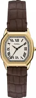 Модель имеет текстурированный кремовый циферблат с черными римскими цифрами и черными часовой, минутной и секундной стрелками. Циферблат обрамлен восьмиугольным корпусом из нержавеющей стали золотистого оттенка. Диаметр корпуса составляет 27 мм. Часы дополнены коричневым кожаным ремешком с тиснением под крокодила, застегивающимся на однозубчатую пряжку. Тип механизма - кварцевый. Водозащита 30 метров (3 АТМ/bar): минимальная защита от мелких брызг. Часы не предназначены для погружения в воду.