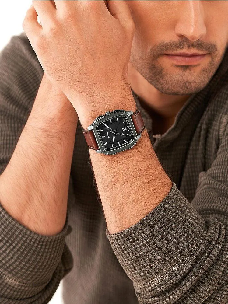 Четкие линии стального корпуса смотрятся особенного эффектно в сочетании со стильным кожаным ремешком. Модные кварцевые наручные часы. Квадратный стальной корпус с минеральным стеклом. Безель украшен стильными винтами. Циферблат украшен рельефным декоративным узором. Метки в виде штрихов. Метки и стрелки с люминесцентным покрытием, которое светится в темноте после непродолжительной зарядки на свету. Окошко даты находится в положении 6 часов. Рифленая заводная головка. Фирменный кожаный ремешок LiteHide с классической застежкой.