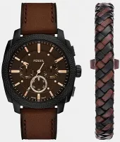 Мужские часы-хронограф с массивным 44-миллиметровым корпусом из черной нержавеющей стали сочетают в себе спортивный функционал и стильную эстетику. Модель с коричневым циферблатом оснащена тремя дополнительными счетчиками для измерения 60-секундных, 30-минутных и 24-часовых интервалов, а фиксированный черный безель подчеркивает динамичный характер часов. Минеральное стекло обеспечивает защиту от царапин, а водонепроницаемость 5 ATM (50 метров) позволяет использовать часы во время плавания. Коричневый кожаный ремешок шириной 22 мм с классической пряжкой дополнен стильным плетеным браслетом в комплекте, создавая универсальный образ для повседневной носки и активного отдыха.