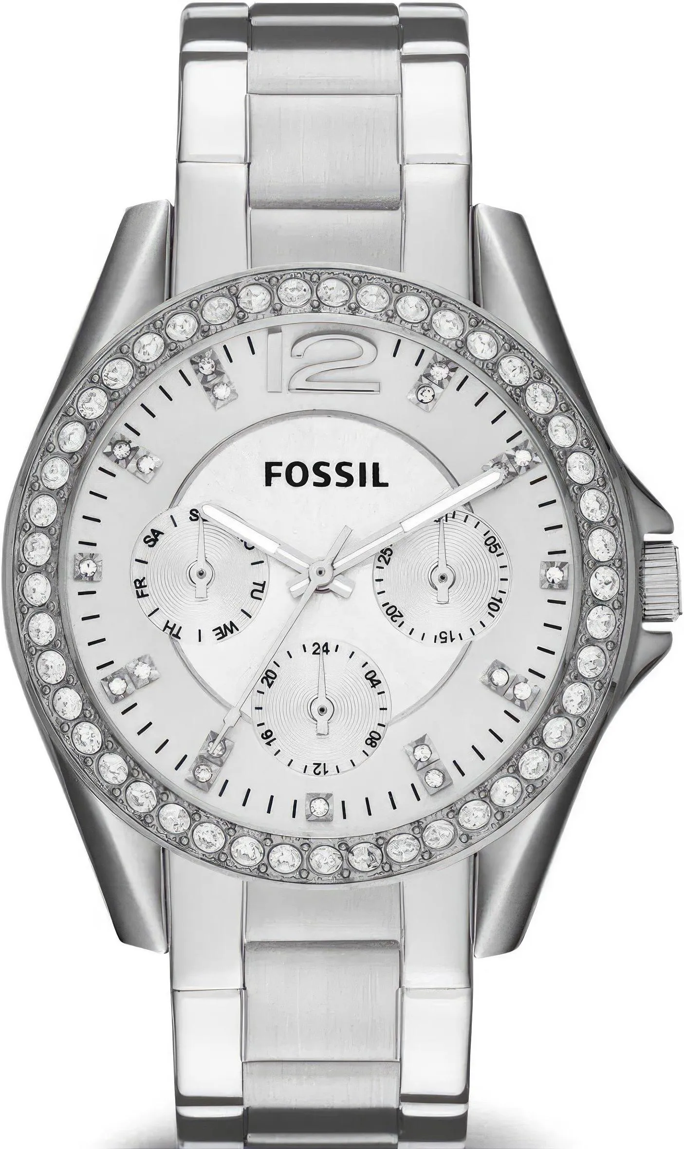 Женские часы с полным календарем и стрелочным указателем времени суток на стальном браслете