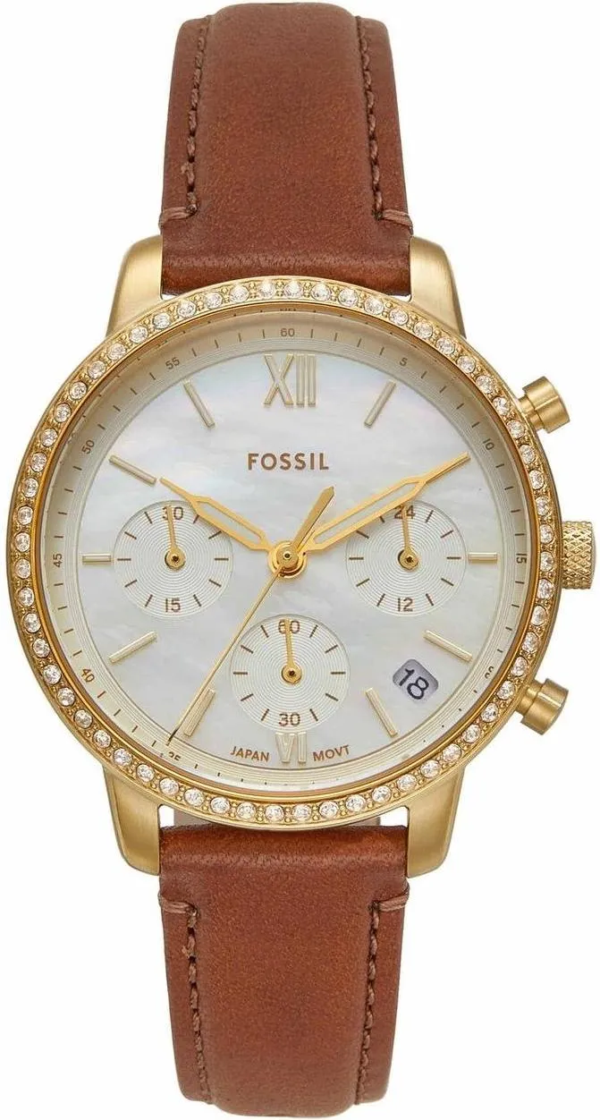 Женские наручные часы Fossil Neutra ES5278. Точный кварцевый механизм с аналоговой индикацией. Ремешок изготовлен из кожи. Браслет из нержавеющей стали. Прочное, устойчивое к царапинам минеральное стекло защищает часы от повреждений. На циферблате отображается текущее число месяца. Часы являются водонепроницаемыми до 5 Бар. Цвет циферблата: Коричневый. Цвет циферблата: Желтое золото. Цвет корпуса: Белый. Толщина: 10.5 мм. Гарантия: 2 года.