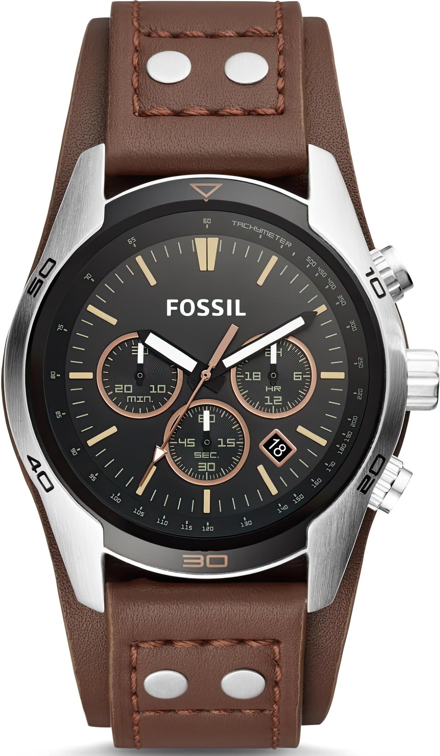 Мужские часы с функцией хронографа, выполненные в спортивном стиле. Корпус из нерж. стали на широком кожаном ремешке. Циферблат с тахометрической шкалой. Точный кварцевый механизм с хронографом и индикацией времени суток в 24-часовом формате.