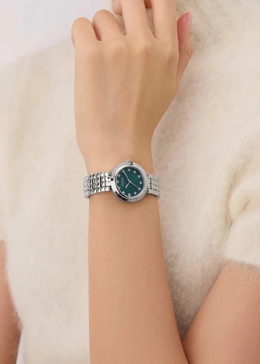 Женские наручные часы Guess Bejeweled GW0930L1. Точный кварцевый механизм с аналоговой индикацией. В отличие от механических часов, не требуют завода и работают от батареи, показывая отклонение всего несколько секунд в месяц. Браслет из нержавеющей стали обладает высокой прочностью и износостойкостью, обеспечивая долговечность даже при активной эксплуатации. Материал устойчив к коррозии и сохраняет свой внешний вид надолго. Корпус изготовлен из высококачественной нержавеющей стали 316L с высокими антикоррозийными свойствами. Прочное, устойчивое к царапинам минеральное стекло защищает часы от повреждений. Часы являются водонепроницаемыми до 3 Бар. Цвет корпуса: Серебристый. Цвет циферблата: Зеленый. Высота (с ушками): 28 мм. Толщина: 8 мм. Гарантия: 2 года.