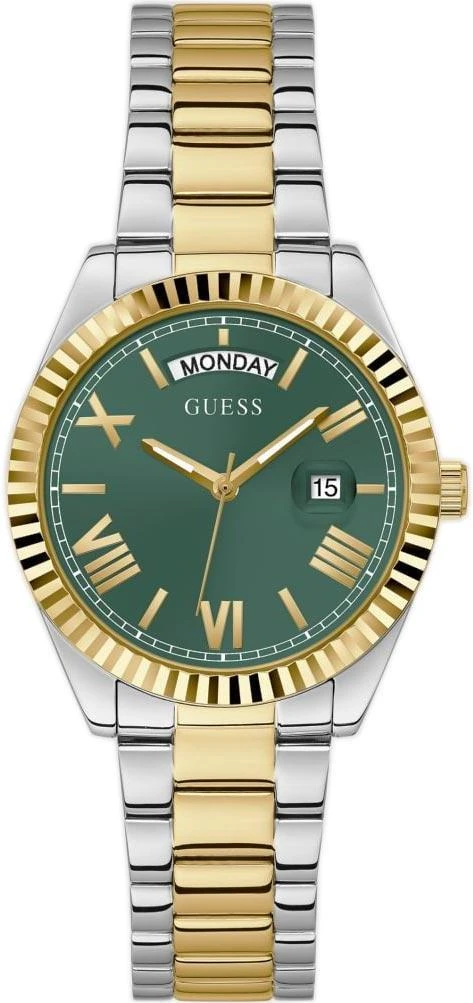 Мужские наручные часы Guess Steel GW0308L5. Точный кварцевый механизм с аналоговой индикацией. Корпус изготовлен из высококачественной нержавеющей стали 316L с высокими антикоррозийными свойствами. На стрелки и отметки нанесен светонакопительный состав, благодаря этому считывать информацию с циферблата возможно и в темноте. На циферблате отображается текущее число месяца и день недели. Браслет из нержавеющей стали. Прочное, устойчивое к царапинам минеральное стекло защищает часы от повреждений. Часы являются водонепроницаемыми до 3 Бар. Цвет корпуса: Серебристый. Цвет циферблата: Зеленый. Ширина (с заводной головкой): 36мм. Толщина: 9мм. Гарантия: 2 года.