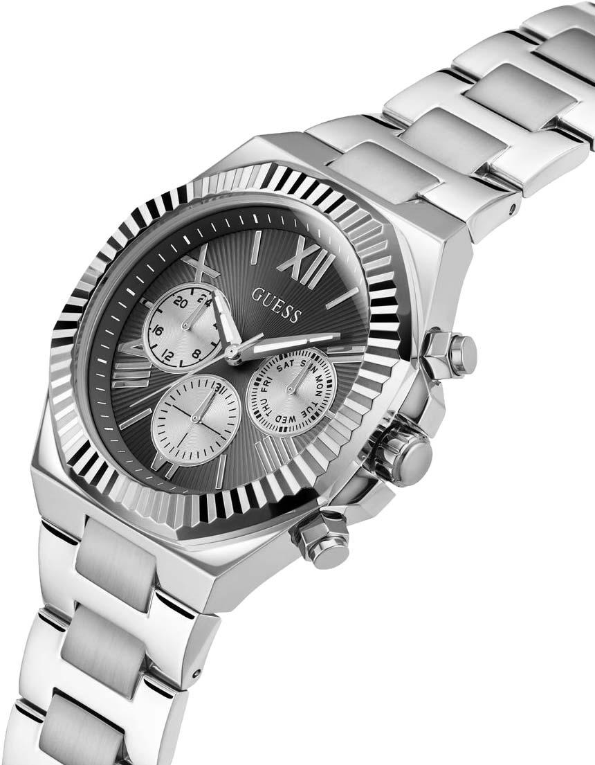 Практичные мужские часы Guess Equity станут идеальным дополнением повседневного стиля. Модель со стальным корпусом сочетает гильошированный циферблат Sunray с римскими цифрами и функцию полного календаря с отдельными окнами для дня недели и даты. Оснащена рифленой заводной головкой с защитой и надежным браслетом с застежкой.