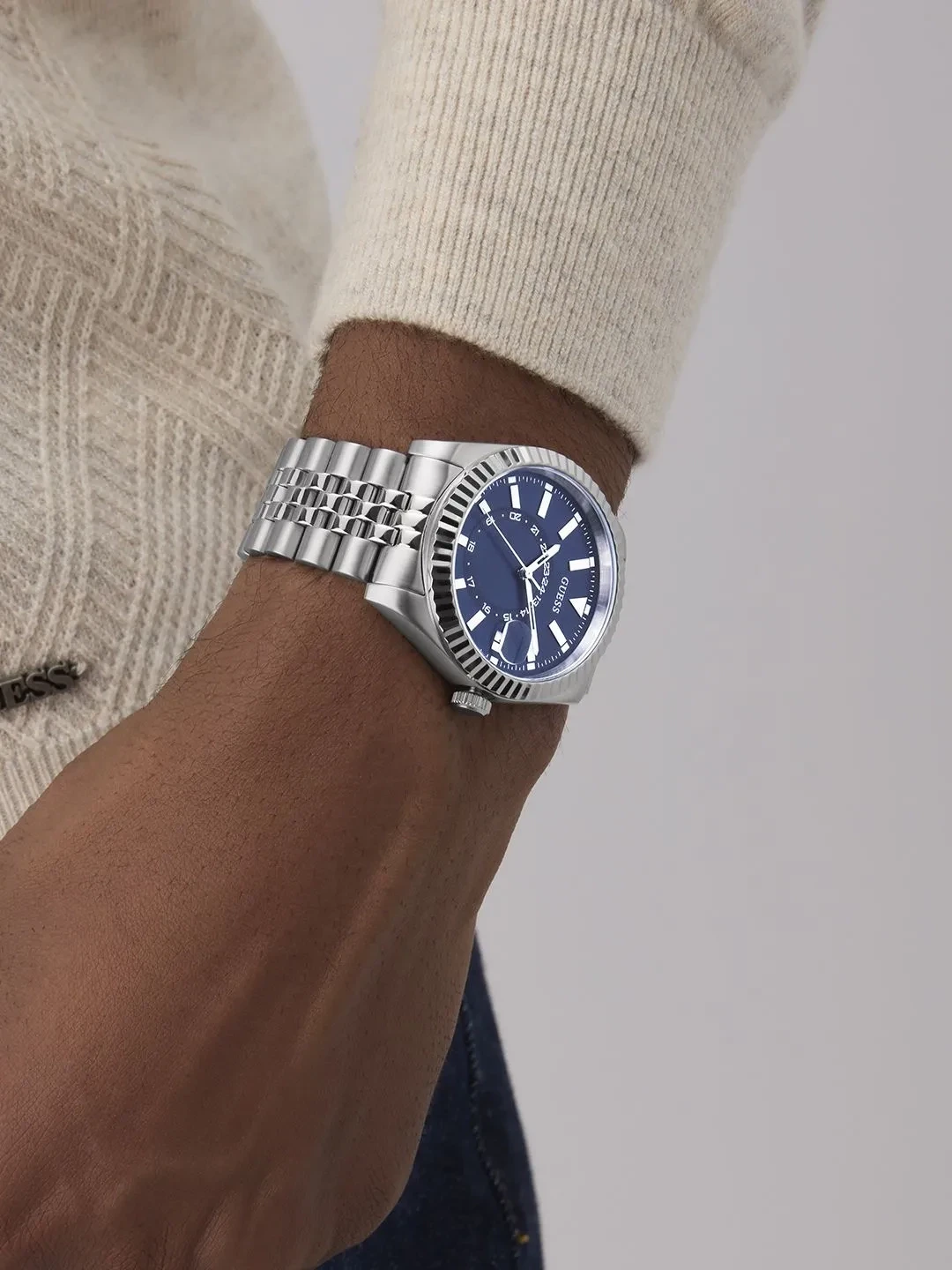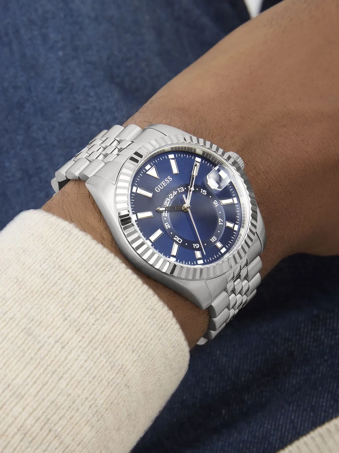 Мужские наручные часы Guess Dress GW0977G1. Точный кварцевый механизм с аналоговой индикацией. В отличие от механических часов, не требуют завода и работают от батареи, показывая отклонение всего несколько секунд в месяц. На стрелки и отметки нанесен светонакопительный состав, благодаря этому считывать информацию с циферблата возможно и в темноте. Браслет из нержавеющей стали обладает высокой прочностью и износостойкостью, обеспечивая долговечность даже при активной эксплуатации. Материал устойчив к коррозии и сохраняет свой внешний вид надолго. Отображение времени возможно в 12-часовом или 24-часовом формате. Корпус изготовлен из высококачественной нержавеющей стали 316L с высокими антикоррозийными свойствами. Прочное, устойчивое к царапинам минеральное стекло защищает часы от повреждений. Часы являются водонепроницаемыми до 5 Бар. Цвет корпуса: Серебристый. Цвет циферблата: Синий. Высота (с ушками): 42 мм. Толщина: 11 мм. Гарантия: 2 года.