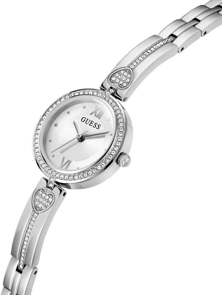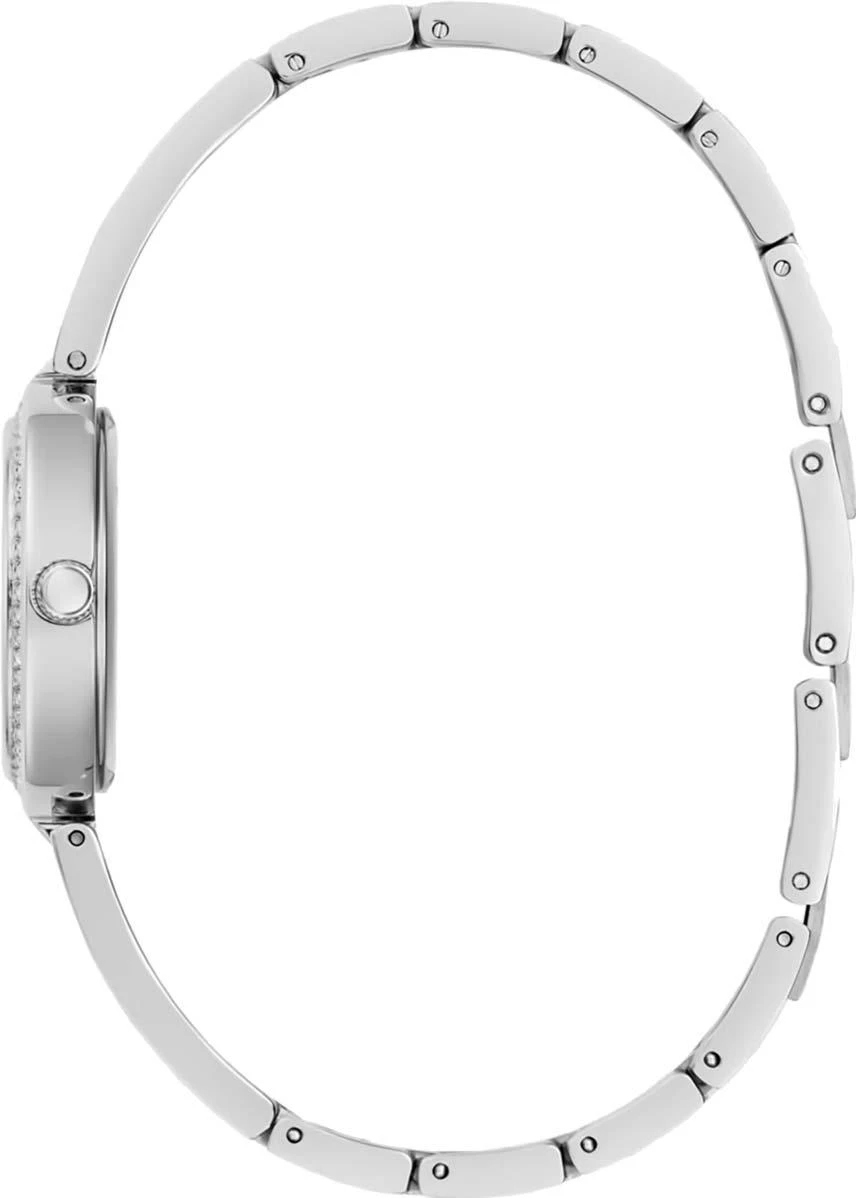 Элегантные женские часы Lovey с круглым стальным корпусом, инкрустированные кристаллами, отличаются нежным мерцанием. Модель оснащена гильошированным циферблатом с метками в виде точек и римских цифр VI и XII, а также рифленой заводной головкой.