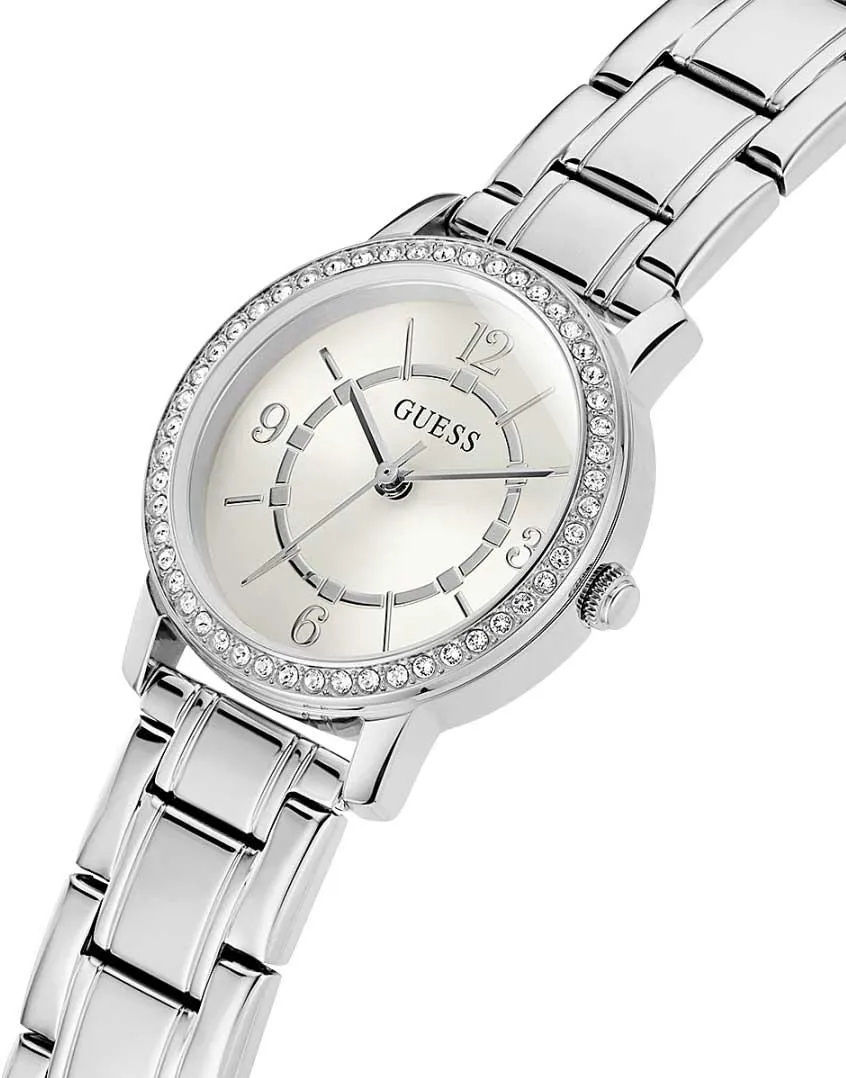 Женские наручные часы Guess Melody GW0468L1. Точный кварцевый механизм с аналоговой индикацией. Корпус изготовлен из высококачественной нержавеющей стали 316L с высокими антикоррозийными свойствами. Браслет из нержавеющей стали. Прочное, устойчивое к царапинам минеральное стекло защищает часы от повреждений. Часы являются водонепроницаемыми до 3 Бар. Цвет корпуса: Серебристый. Цвет циферблата: Серебристый. Ширина (с заводной головкой): 28мм. Толщина: 8мм. Гарантия: 2 года.