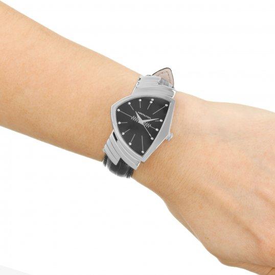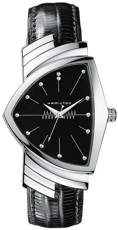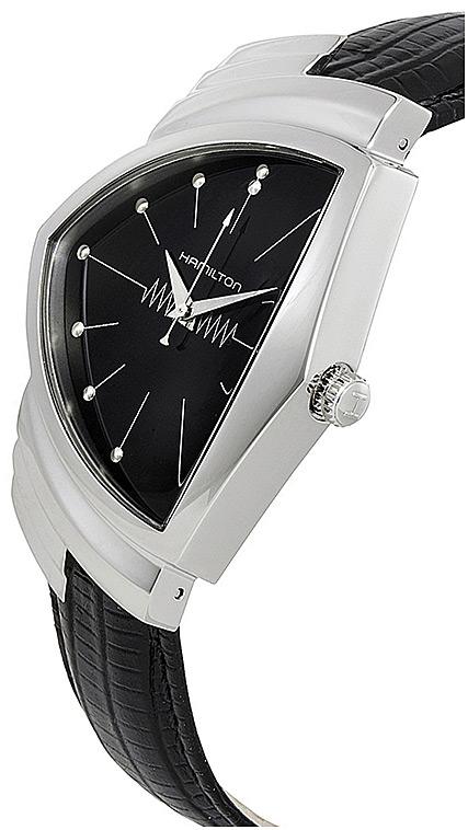<b>Мужские наручные часы Hamilton Ventura H24411732.</b> Точный кварцевый механизм с аналоговой индикацией. Корпус изготовлен из высококачественной нержавеющей стали 316L с высокими антикоррозийными свойствами. Ремешок изготовлен из кожи. Прочное, устойчивое к царапинам минеральное стекло защищает часы от повреждений. Часы являются водонепроницаемыми до 5 Бар. Цвет корпуса: Серебристый. Цвет циферблата: Черный. Гарантия: 2 года.