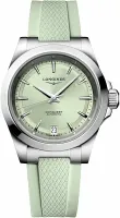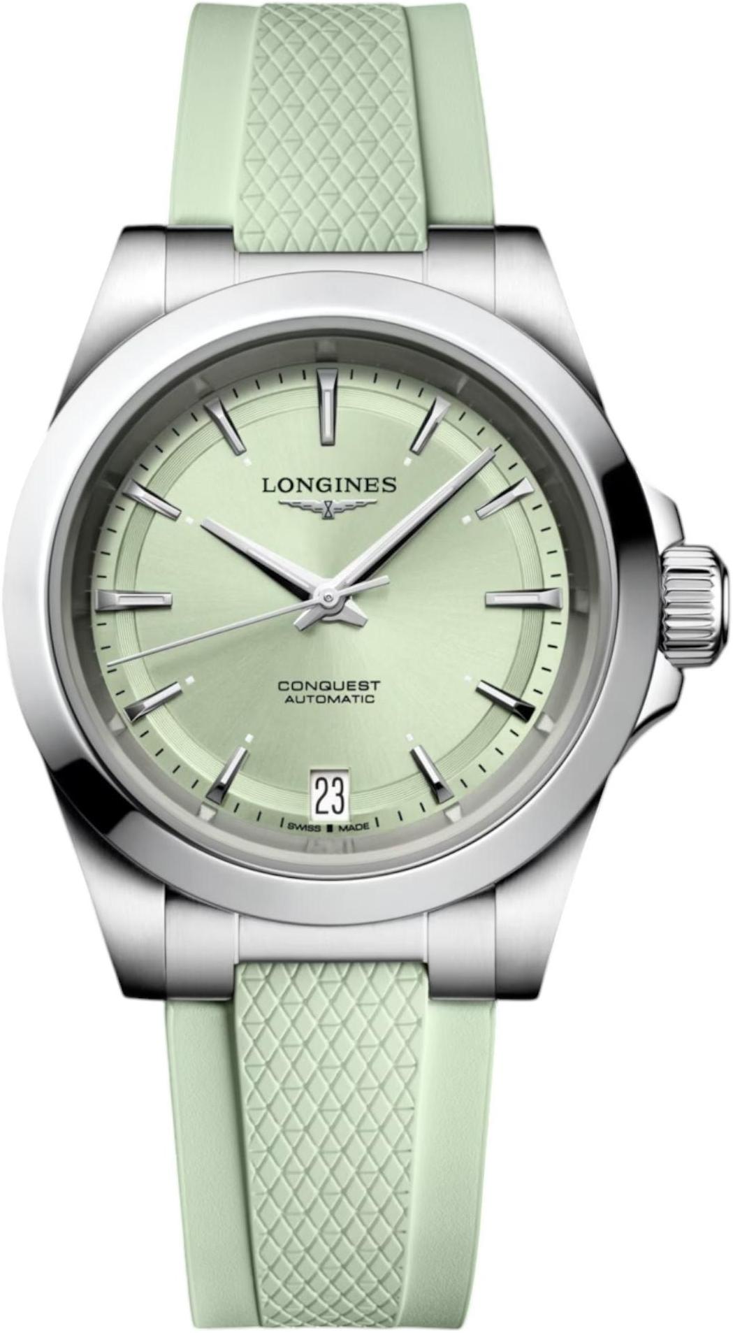 Женские швейцарские механические часы с автоподзаводом Longines Conquest L3.430.4.02.9. Автоматический механизм с частотой баланса 25 200 полуколебаний в час и монокристаллической кремниевой спиралью баланса, обеспечивающей запас хода ок. 72 часов. Устойчивое к царапинам сапфировое стекло с многослойным антибликовым покрытием с обеих сторон. Корпус часов изготовлен из нержавеющей стали. Циферблат выполнен по технологии Sunray (солнечные лучи). Стрелки с люминесцентным покрытием. Окошко даты в положении 6 часов. Прозрачная задняя крышка. Завинчивающаяся заводная головка. Класс водозащиты 100 метров (10 АТМ/bar): часы подходят для плавания и погружения на глубину 5-7 м (выдвигать заводную головку и нажимать кнопки, находясь в воде, нельзя). Каучуковый ремешок. Складная застежка с двойной защитой и системой микронастройки.