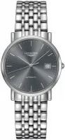Корпус из нержавеющей стали с браслетом из нержавеющей стали. Фиксированный безель из нержавеющей стали. Серый циферблат с узором «солнечные лучи» с серебристыми стрелками и часовыми метками. Тип циферблата: аналоговый. Дата в положении «3 часа». Механизм Longines калибра L619 с автоподзаводом на базе ETA 2892-A2, содержащий 21 камень, с частотой 28800 полуколебаний в час и запасом хода около 42 часов. Сапфировое стекло, устойчивое к царапинам. Заводная головка с выдвижной/нажимной ручкой. Прозрачная задняя крышка. Круглая форма корпуса. Размер корпуса: 34,5 мм. Толщина корпуса: 6 мм. Ширина ремешка: 20,3 мм. Раскладывающаяся застежка с кнопкой. Водонепроницаемость до 30 метров / 100 футов. Функции: дата, часы, минуты, секунды.