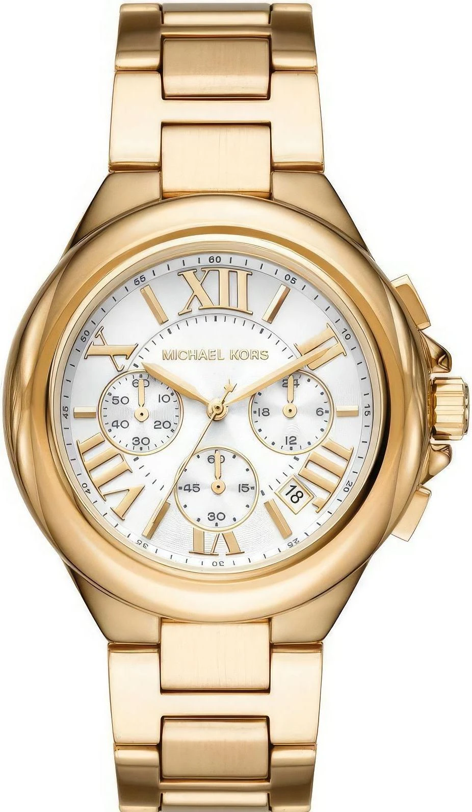 Мужские наручные часы Michael Kors Camille MK7270. Точный кварцевый механизм с аналоговой индикацией. Браслет из нержавеющей стали. Функция хронографа. Отображение времени возможно в 12-часовом или 24-часовом формате. Браслет из нержавеющей стали. Прочное, устойчивое к царапинам минеральное стекло защищает часы от повреждений. На циферблате отображается текущее число месяца. Часы являются водонепроницаемыми до 5 Бар. Цвет циферблата: Желтое золото. Цвет корпуса: Белый. Цвет корпуса: Серебристый. Толщина: 12 мм. Гарантия: 2 года.