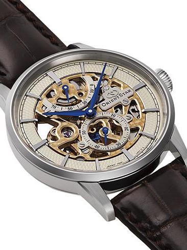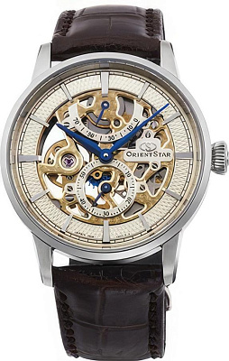 Мужские механические наручные часы с автоподзаводом и возможностью ручного завода серии Orient Star Skeleton. Круглый стальной корпус. Скелетированный циферблат. Сапфировое стекло. Водозащита 50 м. Коричневый кожаный ремешок. Раскладывающийся замок.