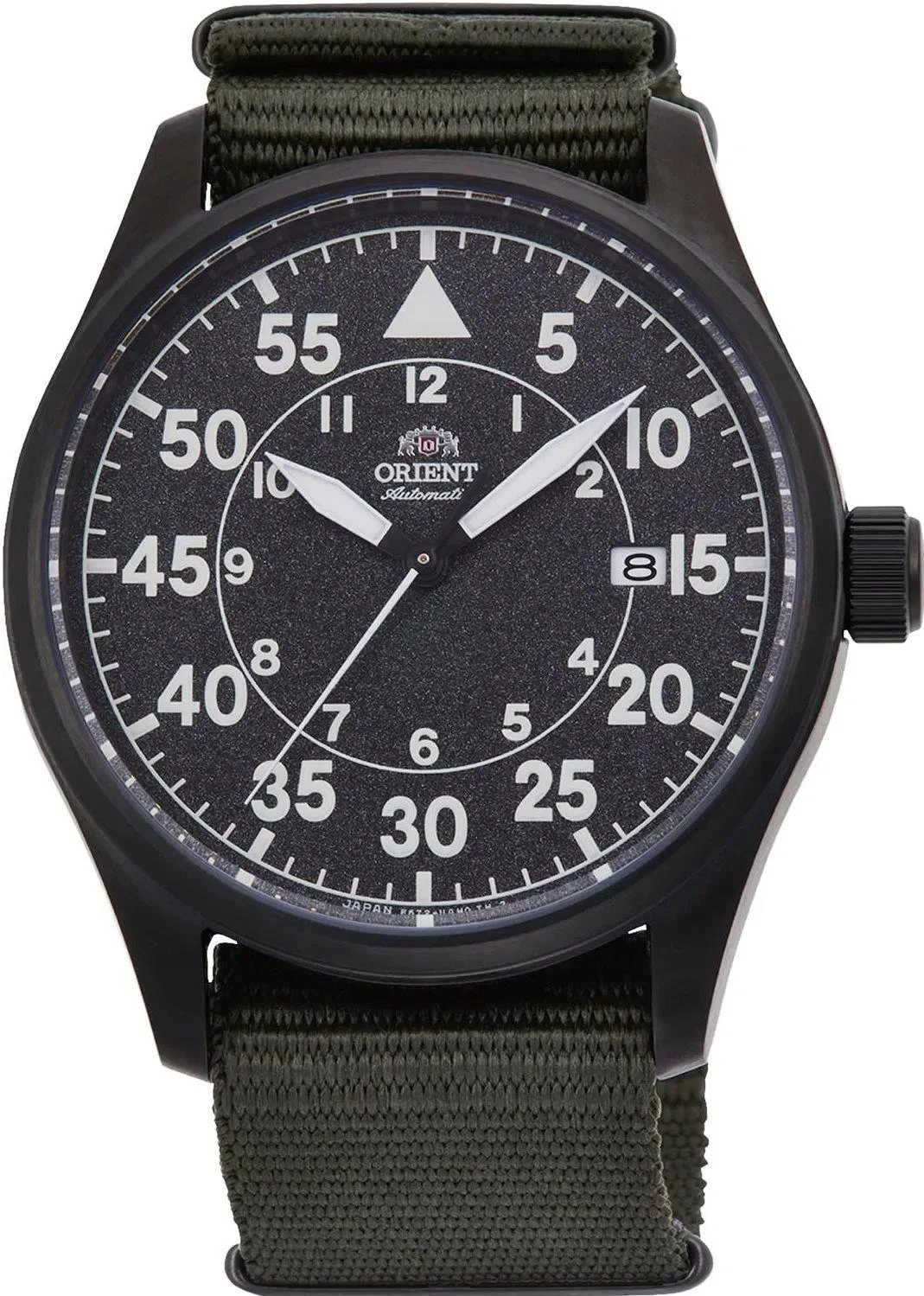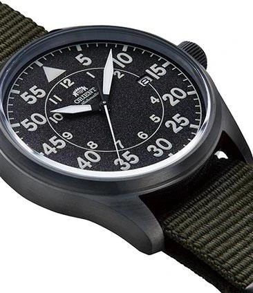 <b>Мужские механические часы с автоподзаводом из серии Classic Automatic. Круглый стальной корпус с PVD покрытием черного цвета. Темно-серый циферблат. Текстильный ремешок темно-зеленого цвета. Ремешковая застежка. Минеральное стекло. Водозащита 100 м.</b><br><br>• Автоматический механизм ORIENT F67(AC) (22 рубиновых камня, частота полуколебаний баланса 21600 полуоб/час).<br>• Автоподзавод. Возможность ручного завода.<br>• Противоударное устройство оси баланса.<br>• Центральная секундная стрелка.<br>• Апертура даты расположена в позиции 3 часов.<br>• Запас хода более 40 часов.<br>• Точность хода не хуже -15…+25 сек./в сутки.<br>• Функция стоп-секунда (остановка секундной стрелки для установки точного времени).<br>• Люминесцентные стрелки и часовые метки.<br>• Круглый корпус выполнен из матовой нержавеющей стали с черным IP покрытием.<br>• Завинчивающаяся заводная головка.<br>• Текстильный ремешок NATO темно-зеленого цвета.<br>• Простая ремешковая застежка.