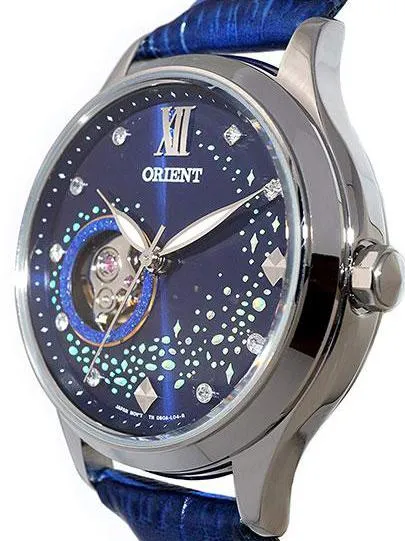Женские часы с стилизацией на тему космоса. Круглый корпус из нерж. стали. Минеральное стекло, прозрачная задняя крышка. Апертура циферблата открывает колебания баланса и работу анкерного спуска. Японский механизм с автоподзаводом.
