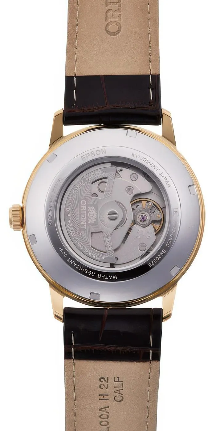 Мужские наручные часы Orient Automatic RN-AC0F04S. Механические с ручным подзаводом. Ремешок изготовлен из кожи. Браслет из нержавеющей стали. Прочное, устойчивое к царапинам минеральное стекло защищает часы от повреждений. На циферблате отображается текущее число месяца. Часы являются водонепроницаемыми до 5 Бар. Цвет циферблата: Желтое золото. Цвет корпуса: Белый. Толщина: 12 мм. Гарантия: 2 года.