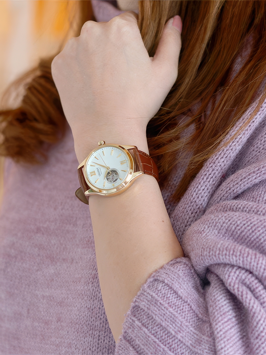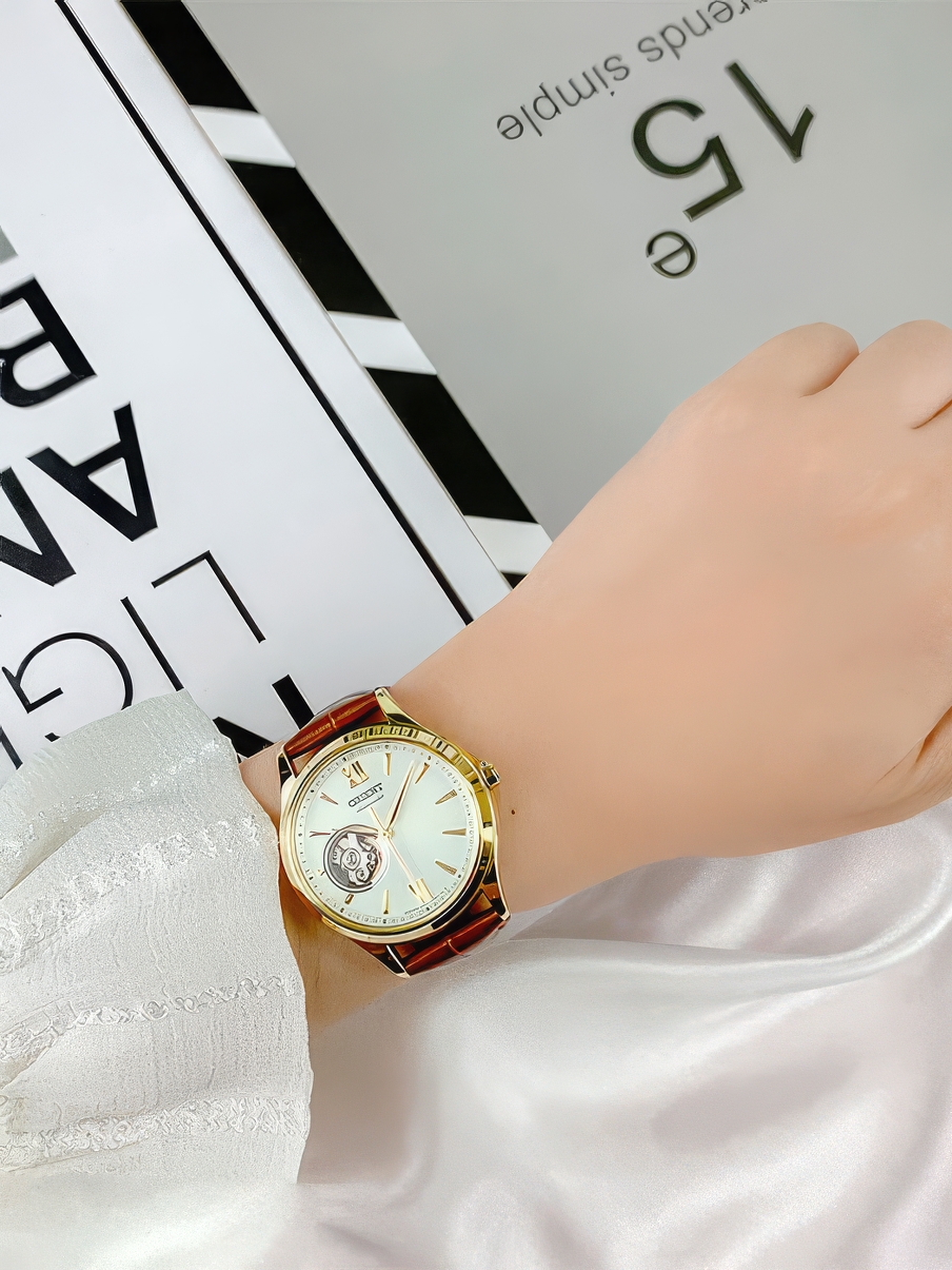 Женские наручные часы Orient Automatic RN-AG0728S. Механические с автоподзаводом. Пружина механизма заводится автоматически благодаря естественным движениям владельца в процессе ежедневной носки часов. Ремешок изготовлен из кожи. Браслет из нержавеющей стали. Прочное, устойчивое к царапинам минеральное стекло защищает часы от повреждений. Часы являются водонепроницаемыми до 3 Бар. Цвет циферблата: Желтое золото. Цвет корпуса: Белый. Толщина: 12 мм. Гарантия: 2 года.