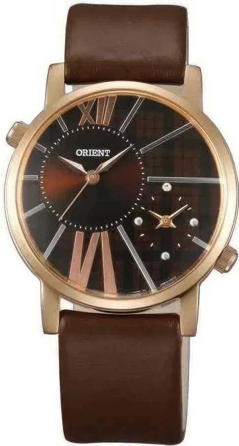 Наручные женские часы от фирмы Orient (безупречное качество и надежный японский механизм). • Точный кварцевый механизм. • Минеральное стекло устойчивое к возникновению царапин. • Корпус из высококачественного стального сплава 316L с высокими антикоррозийными свойствами со стойким PVD покрытием. • Инкрустация циферблата кристаллом Swarovski. • Ремешок из натуральной кожи. • Покрытие корпуса: стойкое PVD . • Форма циферблата – круглый. • Размеры – диаметр 35 мм, толщина 7 мм. • Цвет – коричневый. • Водозащита до 3 АТМ. • Дополнительно – второй часовой пояс.