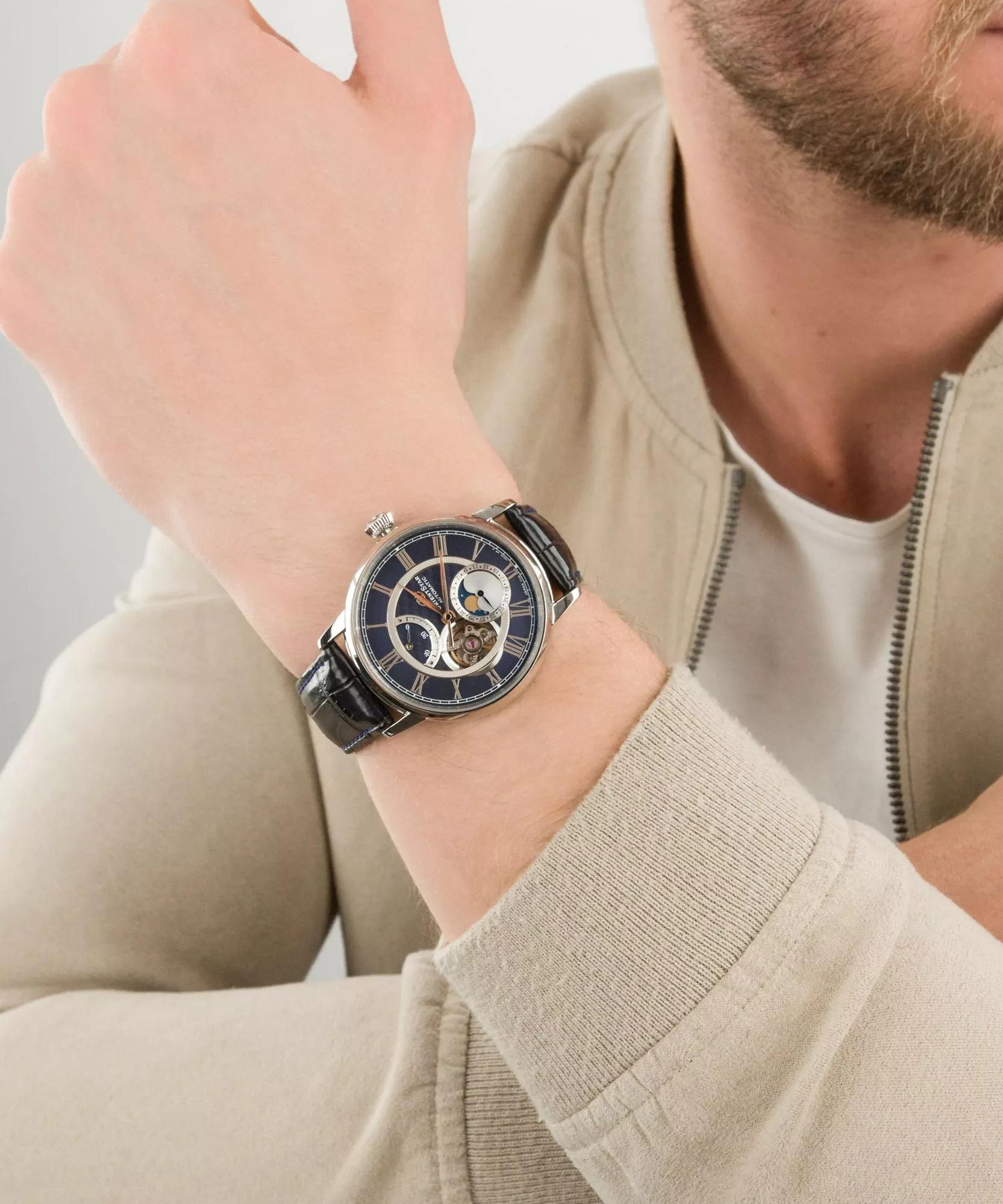 Мужские наручные часы Orient Orient Star RE-AM0002L. Механические с ручным подзаводом. Ремешок изготовлен из кожи. Индикатор запаса хода. Отображение фаз Луны. Часы определяют возраст Луны в текущий момент для текущего местоположения. Браслет из нержавеющей стали. Сапфировое стекло. Искусственно изготовленное стекло с высокой прочностью и устойчивостью к царапинам. На циферблате отображается текущее число месяца. Часы являются водонепроницаемыми до 5 Бар. Цвет циферблата: Серебристый. Цвет корпуса: Синий. Цвет корпуса: Серебристый. Толщина: 14 мм. Гарантия: 2 года.