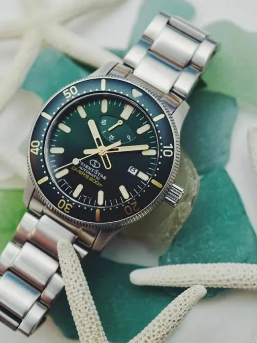 Мужские наручные часы Orient Orient Star RE-AU0307E. Механические с ручным подзаводом. Браслет из нержавеющей стали. Индикатор запаса хода. Браслет из нержавеющей стали. Сапфировое стекло. Искусственно изготовленное стекло с высокой прочностью и устойчивостью к царапинам. На циферблате отображается текущее число месяца. Часы являются водонепроницаемыми до 20 Бар. Цвет циферблата: Зеленый. Цвет циферблата: Серебристый. Цвет корпуса: Зеленый. На стрелки и отметки нанесен светонакопительный состав, благодаря этому считывать информацию с циферблата возможно и в темноте. Толщина: 14 мм. Гарантия: 2 года.