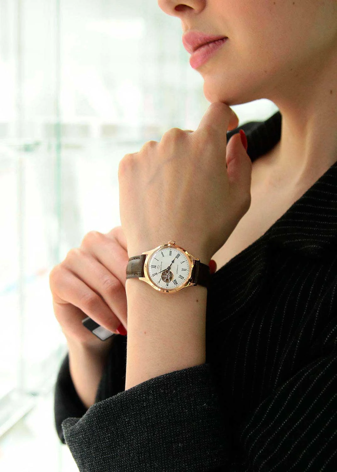 Механические часы с автоподзаводом. Открытый баланс хода. Водостойкость WR 50. Часы, минуты. Корпус выполнен из нержавеющей стали с PVD покрытием. Диаметр корпуса 31 мм. Минеральное стекло. Кожаный ремешок.