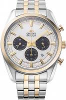 Мужские наручные часы Orient Contemporary RA-TX0302S. Точный кварцевый механизм с аналоговой индикацией. Браслет из нержавеющей стали. Функция хронографа. Солнечная батарейка. Солнечная подзаряжающаяся батарейка обеспечивает питание часов для работы. Браслет из нержавеющей стали. Сапфировое стекло. Искусственно изготовленное стекло с высокой прочностью и устойчивостью к царапинам. На циферблате отображается текущее число месяца. Часы являются водонепроницаемыми до 5 Бар. Цвет циферблата: Серебристый. Цвет циферблата: Желтое золото. Цвет корпуса: Белый. Цвет корпуса: Черный. На стрелки и отметки нанесен светонакопительный состав, благодаря этому считывать информацию с циферблата возможно и в темноте. Высота (с ушками): 48 мм. Толщина: 11 мм. Гарантия: 2 года.