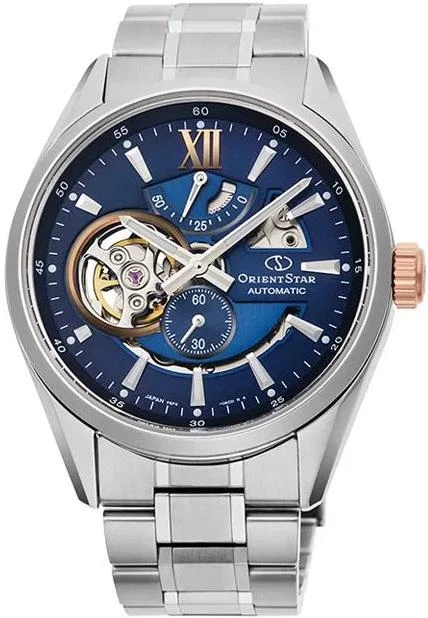 Мужские механические часы с автоподзаводом из серии ORIENT STAR Contemporary Modern Skeleton. Круглый стальной корпус. Синий циферблат. Сапфировое стекло с антибликовым покрытием. Водозащита 100м. Стальной браслет. Раскладывающаяся застежка.