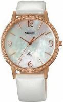 Изысканные женские наручные часы с перламутровым циферблатом на белом кожаном ремешке.