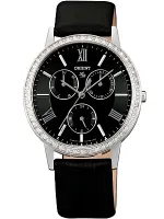 Женские наручные часы в стальном корпусе украшенном цирконами на кожаном ремешке. Циферблат со стрелочными указателями даты, дня недели и 12/24 часовая шкала.